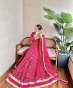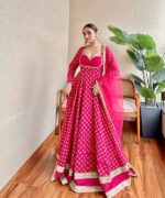 “Turn heads this festive season with our Fuchsia Pink Raw Silk Anarkali Set from the exclusive Karwachauth ’25 Collection. Crafted in premium Raw Silk, this floor-length Anarkali is adorned with intricate golden zari work in a lattice pattern, lending it a regal and timeless charm. The sweetheart neckline blouse with full sleeves adds a modern touch, while the flared silhouette enhances its festive elegance.