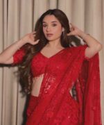 “Elevate your festive wardrobe with this stunning red net embroidered saree from our latest Karwa Chauth Collection ’25. Crafted in delicate net fabric, the saree features intricate sequin and thread embroidery that beautifully enhances its sheer elegance. Paired with a matching net blouse, adorned with embroidery and sequins over a soft crepe lining, the ensemble strikes the perfect balance between tradition and modern sophistication.